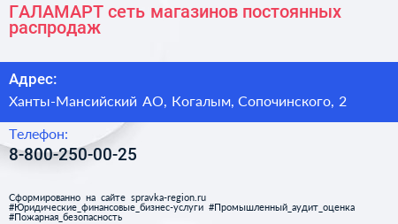 ГАЛАМАРТ, сеть магазинов постоянных распродаж по адресу Ханты-Мансийский АО, Когалым, Сопочинского, 2 в дальнейшем Организация, размещена в следующих категориях:
