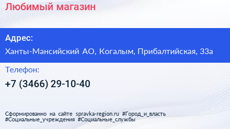 Любимый, магазин по адресу Ханты-Мансийский АО, Когалым, Прибалтийская, 33а в дальнейшем Организация, размещена в следующих категориях: