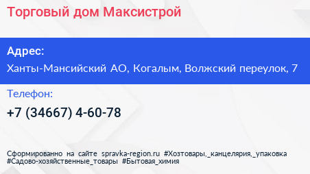 Торговый дом Максистрой по адресу Ханты-Мансийский АО, Когалым, Волжский переулок, 7 в дальнейшем Организация, размещена в следующих категориях: