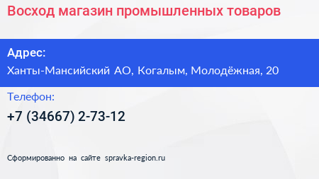 Восход, магазин промышленных товаров по адресу Ханты-Мансийский АО, Когалым, Молодёжная, 20 в дальнейшем Организация, размещена в следующих категориях: