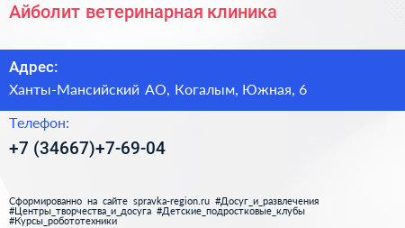 Айболит, ветеринарная клиника по адресу Ханты-Мансийский АО, Когалым, Южная, 6 в дальнейшем Организация, размещена в следующих категориях: