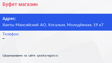 Буфет, магазин по адресу Ханты-Мансийский АО, Когалым, Молодёжная, 19 к7 в дальнейшем Организация, размещена в следующих категориях: