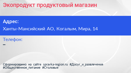 Экопродукт, продуктовый магазин по адресу Ханты-Мансийский АО, Когалым, Мира, 14 в дальнейшем Организация, размещена в следующих категориях: