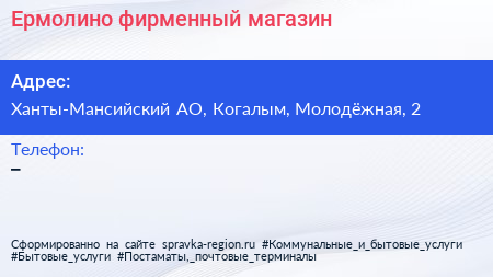 Ермолино, фирменный магазин по адресу Ханты-Мансийский АО, Когалым, Молодёжная, 2 в дальнейшем Организация, размещена в следующих категориях: