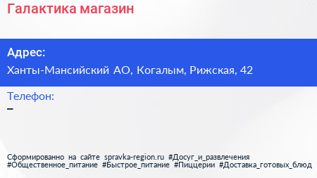 Галактика, магазин по адресу Ханты-Мансийский АО, Когалым, Рижская, 42 в дальнейшем Организация, размещена в следующих категориях: