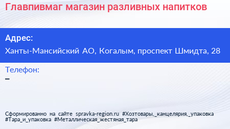 Главпивмаг, магазин разливных напитков по адресу Ханты-Мансийский АО, Когалым, проспект Шмидта, 28 в дальнейшем Организация, размещена в следующих категориях:
