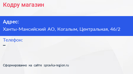Кодру, магазин по адресу Ханты-Мансийский АО, Когалым, Центральная, 46/2 в дальнейшем Организация, размещена в следующих категориях: