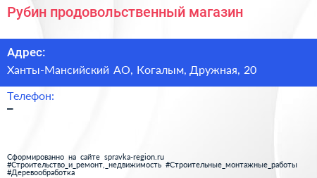 Рубин, продовольственный магазин по адресу Ханты-Мансийский АО, Когалым, Дружная, 20 в дальнейшем Организация, размещена в следующих категориях: