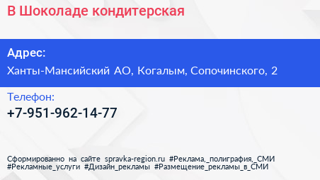 В Шоколаде, кондитерская по адресу Ханты-Мансийский АО, Когалым, Сопочинского, 2 в дальнейшем Организация, размещена в следующих категориях: