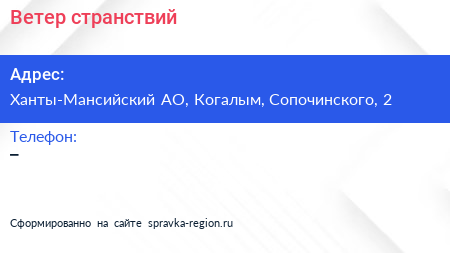 Ветер странствий по адресу Ханты-Мансийский АО, Когалым, Сопочинского, 2 в дальнейшем Организация, размещена в следующих категориях: