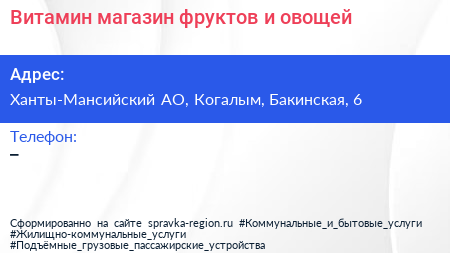 Витамин, магазин фруктов и овощей по адресу Ханты-Мансийский АО, Когалым, Бакинская, 6 в дальнейшем Организация, размещена в следующих категориях: