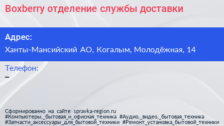 Boxberry, отделение службы доставки по адресу Ханты-Мансийский АО, Когалым, Молодёжная, 14 в дальнейшем Организация, размещена в следующих категориях: