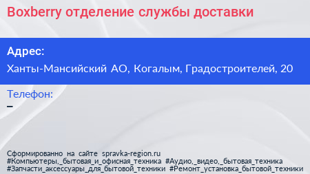 Boxberry, отделение службы доставки по адресу Ханты-Мансийский АО, Когалым, Градостроителей, 20 в дальнейшем Организация, размещена в следующих категориях:
