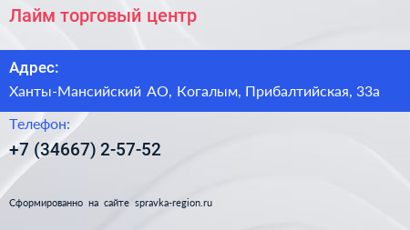 Лайм, торговый центр по адресу Ханты-Мансийский АО, Когалым, Прибалтийская, 33а в дальнейшем Организация, размещена в следующих категориях: