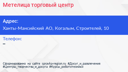 Метелица, торговый центр по адресу Ханты-Мансийский АО, Когалым, Строителей, 10 в дальнейшем Организация, размещена в следующих категориях: