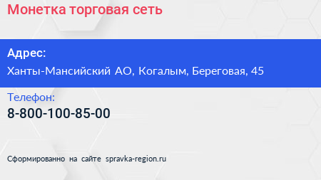 Монетка, торговая сеть по адресу Ханты-Мансийский АО, Когалым, Береговая, 45 в дальнейшем Организация, размещена в следующих категориях: