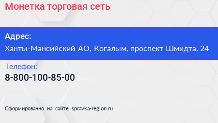 Монетка, торговая сеть по адресу Ханты-Мансийский АО, Когалым, проспект Шмидта, 24 в дальнейшем Организация, размещена в следующих категориях: