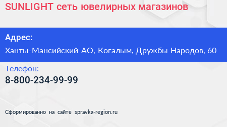 SUNLIGHT, сеть ювелирных магазинов по адресу Ханты-Мансийский АО, Когалым, Дружбы Народов, 60 в дальнейшем Организация, размещена в следующих категориях: