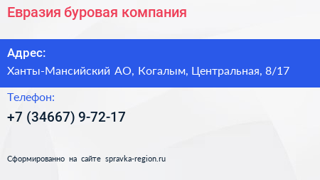 Евразия, буровая компания по адресу Ханты-Мансийский АО, Когалым, Центральная, 8/17 в дальнейшем Организация, размещена в следующих категориях: