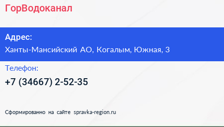 ГорВодоканал по адресу Ханты-Мансийский АО, Когалым, Южная, 3 в дальнейшем Организация, размещена в следующих категориях: