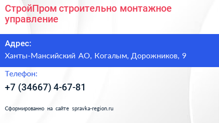 СтройПром, строительно-монтажное управление по адресу Ханты-Мансийский АО, Когалым, Дорожников, 9 в дальнейшем Организация, размещена в следующих категориях: