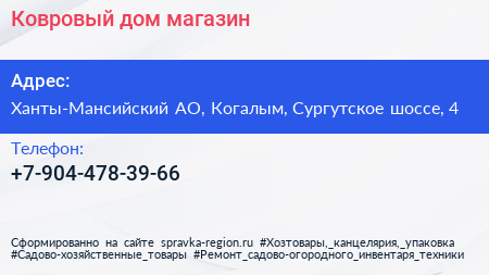 Ковровый дом, магазин по адресу Ханты-Мансийский АО, Когалым, Сургутское шоссе, 4 в дальнейшем Организация, размещена в следующих категориях: