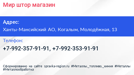 Мир штор, магазин по адресу Ханты-Мансийский АО, Когалым, Молодёжная, 13 в дальнейшем Организация, размещена в следующих категориях: