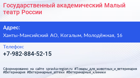 Государственный академический Малый театр России по адресу Ханты-Мансийский АО, Когалым, Молодёжная, 16 в дальнейшем Организация, размещена в следующих категориях: