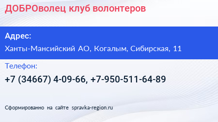 ДОБРОволец, клуб волонтеров по адресу Ханты-Мансийский АО, Когалым, Сибирская, 11 в дальнейшем Организация, размещена в следующих категориях: