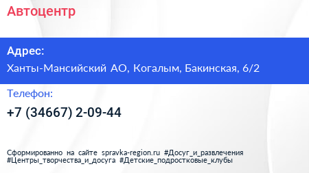 Автоцентр по адресу Ханты-Мансийский АО, Когалым, Бакинская, 6/2 в дальнейшем Организация, размещена в следующих категориях: