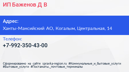 ИП Баженов Д.В. по адресу Ханты-Мансийский АО, Когалым, Центральная, 14 в дальнейшем Организация, размещена в следующих категориях: