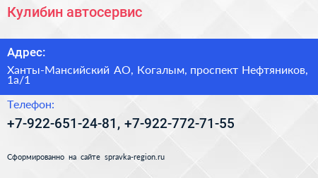 Кулибин, автосервис по адресу Ханты-Мансийский АО, Когалым, проспект Нефтяников, 1а/1 в дальнейшем Организация, размещена в следующих категориях: