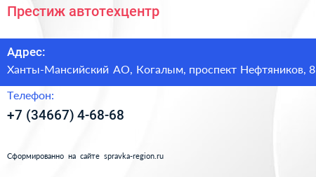 Престиж, автотехцентр по адресу Ханты-Мансийский АО, Когалым, проспект Нефтяников, 8 в дальнейшем Организация, размещена в следующих категориях: