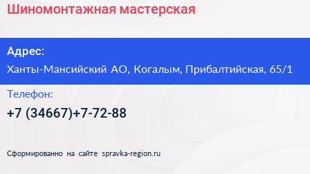 Шиномонтажная мастерская по адресу Ханты-Мансийский АО, Когалым, Прибалтийская, 65/1 в дальнейшем Организация, размещена в следующих категориях: