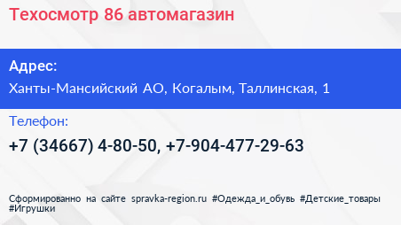 Техосмотр 86, автомагазин по адресу Ханты-Мансийский АО, Когалым, Таллинская, 1 в дальнейшем Организация, размещена в следующих категориях: