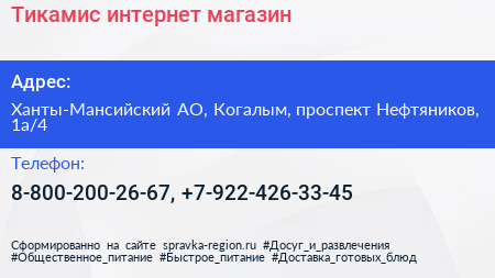 Тикамис, интернет-магазин по адресу Ханты-Мансийский АО, Когалым, проспект Нефтяников, 1а/4 в дальнейшем Организация, размещена в следующих категориях:
