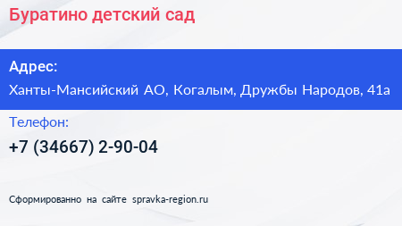 Буратино, детский сад по адресу Ханты-Мансийский АО, Когалым, Дружбы Народов, 41а в дальнейшем Организация, размещена в следующих категориях: