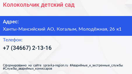 Колокольчик, детский сад по адресу Ханты-Мансийский АО, Когалым, Молодёжная, 26 к1 в дальнейшем Организация, размещена в следующих категориях: