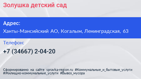 Золушка, детский сад по адресу Ханты-Мансийский АО, Когалым, Ленинградская, 63 в дальнейшем Организация, размещена в следующих категориях:
