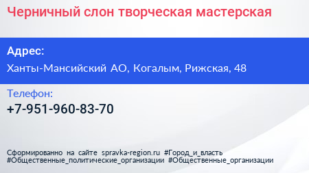 Черничный слон, творческая мастерская по адресу Ханты-Мансийский АО, Когалым, Рижская, 48 в дальнейшем Организация, размещена в следующих категориях: