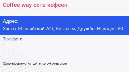 Coffee way, сеть кофеен по адресу Ханты-Мансийский АО, Когалым, Дружбы Народов, 60 в дальнейшем Организация, размещена в следующих категориях: