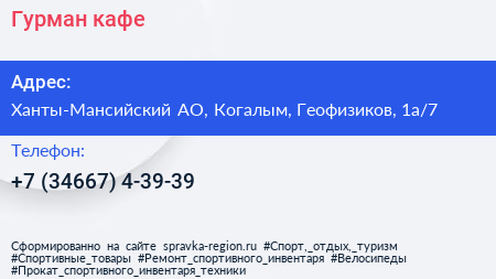 Гурман, кафе по адресу Ханты-Мансийский АО, Когалым, Геофизиков, 1а/7 в дальнейшем Организация, размещена в следующих категориях: