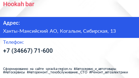Hookah-bar по адресу Ханты-Мансийский АО, Когалым, Сибирская, 13 в дальнейшем Организация, размещена в следующих категориях: