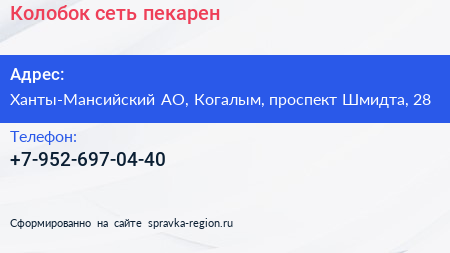 Колобок, сеть пекарен по адресу Ханты-Мансийский АО, Когалым, проспект Шмидта, 28 в дальнейшем Организация, размещена в следующих категориях: