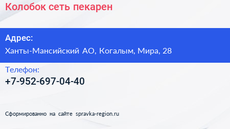 Колобок, сеть пекарен по адресу Ханты-Мансийский АО, Когалым, Мира, 28 в дальнейшем Организация, размещена в следующих категориях: