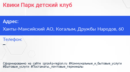 Квики Парк, детский клуб по адресу Ханты-Мансийский АО, Когалым, Дружбы Народов, 60 в дальнейшем Организация, размещена в следующих категориях: