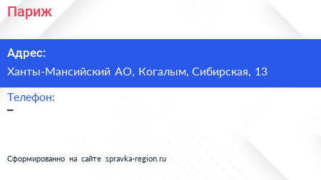 Париж по адресу Ханты-Мансийский АО, Когалым, Сибирская, 13 в дальнейшем Организация, размещена в следующих категориях: