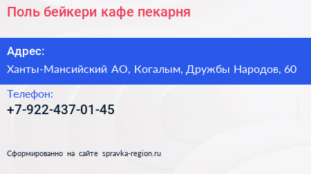 Поль бейкери, кафе-пекарня по адресу Ханты-Мансийский АО, Когалым, Дружбы Народов, 60 в дальнейшем Организация, размещена в следующих категориях: