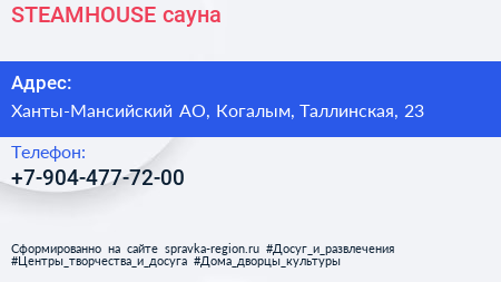 STEAMHOUSE, сауна по адресу Ханты-Мансийский АО, Когалым, Таллинская, 23 в дальнейшем Организация, размещена в следующих категориях: