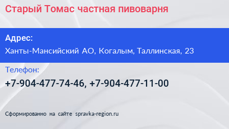 Старый Томас, частная пивоварня по адресу Ханты-Мансийский АО, Когалым, Таллинская, 23 в дальнейшем Организация, размещена в следующих категориях: